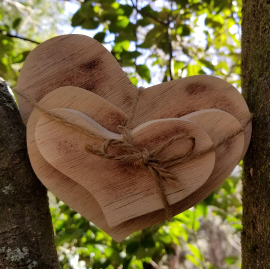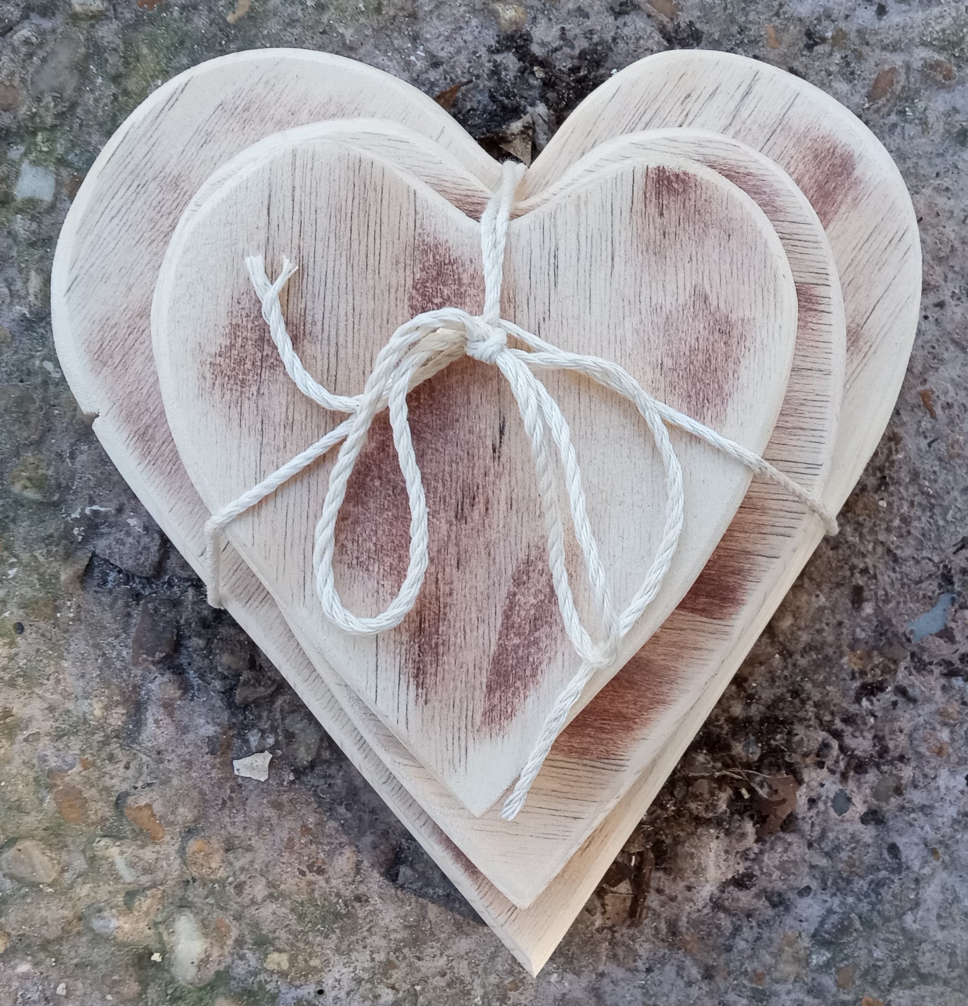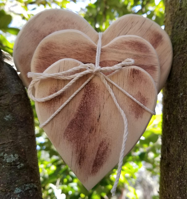 3-pack of pine wooden hearts wrapped in twine. One side has partial staining for the popular vintage look, while the other side is raw, sanded pine. All edges are rounded to accent the gorgeous grain. These are perfect to compliment a table display or to complete a project or craft you're currently completing.